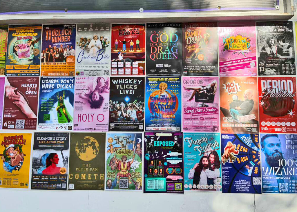 I applied a gradient map to the photo, which replaces dark and light areas with new colours. Choosing pinks and purples gave the photo a monochrome-esque appearance. Once the image treatment and poster layout was finalized, I recreated the design in Canva as a template that could be used for future shows. With each new festival, the poster needs to be adjusted with the relevant dates, locations, and festival logos, as well as adding new quotes, reviews and awards.